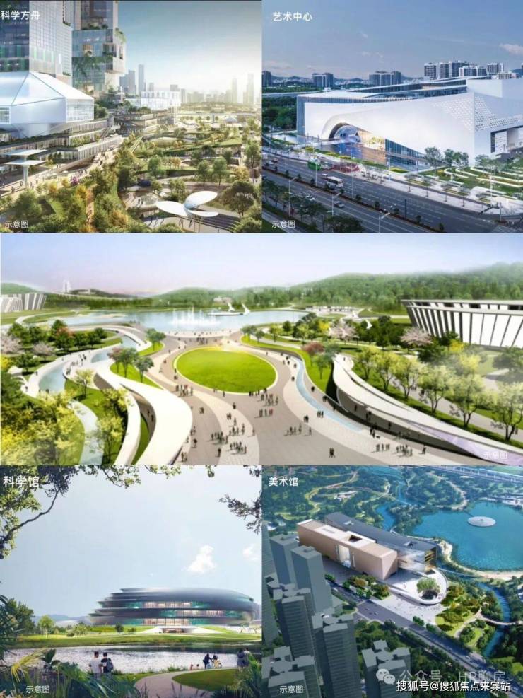 五馆一岛:科技馆(在建)、西方美术馆(在建) 、艺术中心(在建)、书城、科学城体育中心、科学岛(在建)