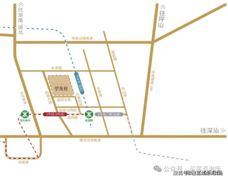 望海府位于8号线盐田路站约700米处,往西半小时到福田中心区,往东8号线二期直达大小梅沙,工作、度假都极其方便。此外盐田路站也是18号线宝盐线在盐田区域内的唯一双地铁交汇枢纽站,届时将串联光明、宝安,实现关内关外半小时生活圈。
