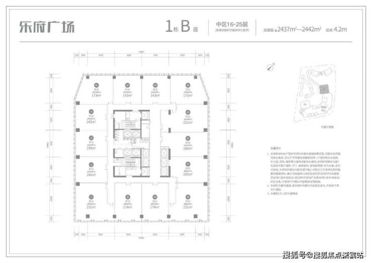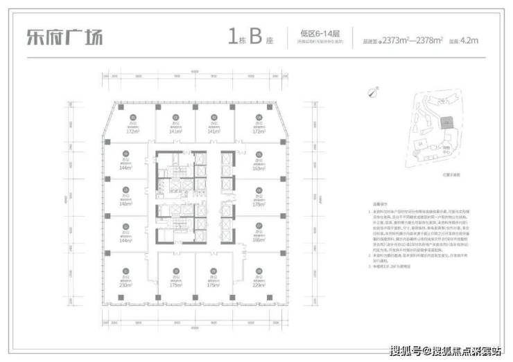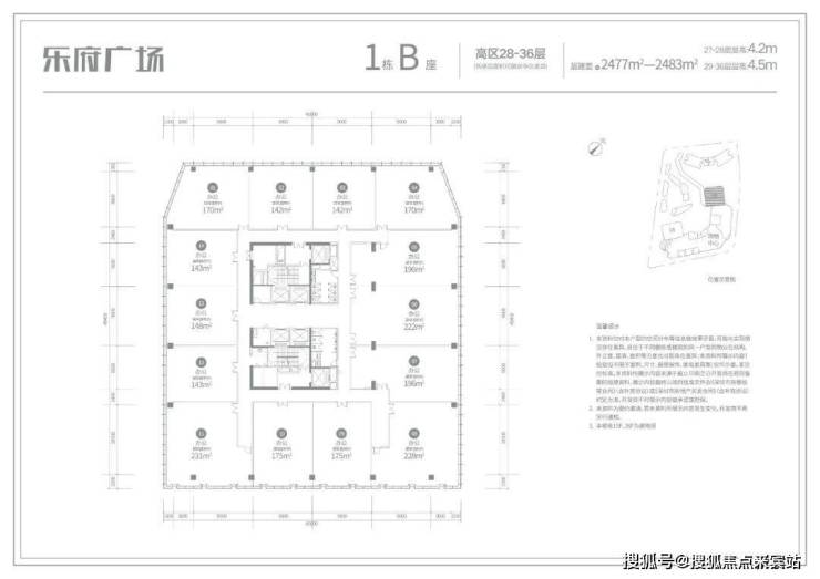层高4.2m~4.5m,标准层面积,2379㎡~2483㎡,主力面积段140~230㎡。