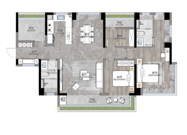 建面约115㎡四房户型,带有独立入户玄关,公共卫生间也设置在入户处,每天回家第一件事就能清洁消毒,将灰尘与细菌隔绝于室内。