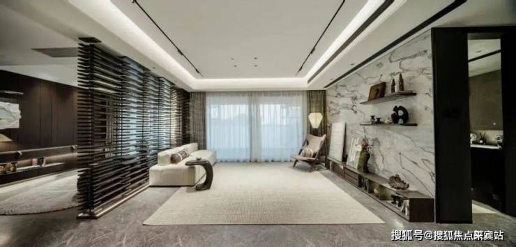 样板间将客厅与客卧打通成近50㎡的大方厅,空间十分阔绰,由于该户型的实用率高,且几乎没有走廊造成空间的浪费,室内的观感足以媲美市面上的130㎡户型,不会有哪个空间显得特别狭小。