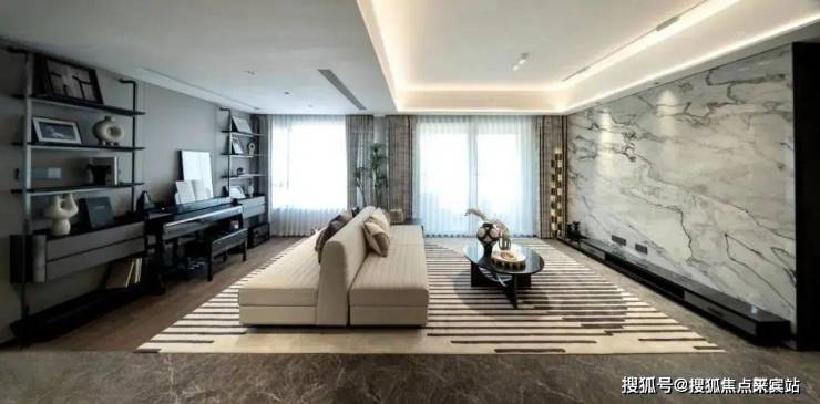 客厅面宽达到4.4米,尺度比市面上大多数140㎡户型都要大,如果不需要那么多房间,也可以将客厅与次卧打通,获得约7.4米长的超大横厅,或者也可以参考样板房设计,将其布置成家庭的私享影音空间。