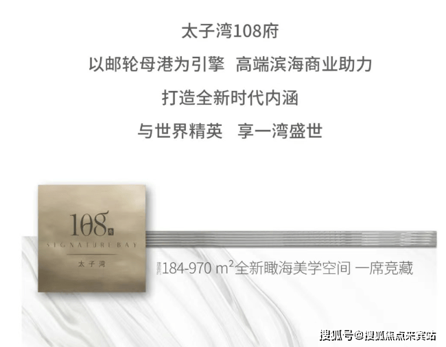 太子湾108府位于南山蛇口太子湾片区,游轮大道西面,总占地1.2万平方米,建面约3万平,集邮轮母港、总部办公、顶级商业、高端居住、五星级酒店、文化艺术国际学校、国际医院等多元业态于一体。世界级国际滨海综合体,在售面积约185-384平2-4房,精装交房。