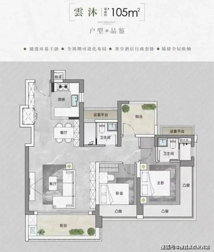 105㎡的3房2厅2卫,设计的是经典竖厅格局,进门入户玄关,超大宽面客厅5米开间,LDKB一体化,S墙设计预留冰箱卡槽位,三开间朝南,3个卧室分别做到了主卧16.62㎡/次卧11.31㎡/次卧7.28㎡(实测面积),U型厨房,卫生间干湿分离,还带2个设备平台,得房率约96.1-96.69%(包含赠送),东南或东北朝向。