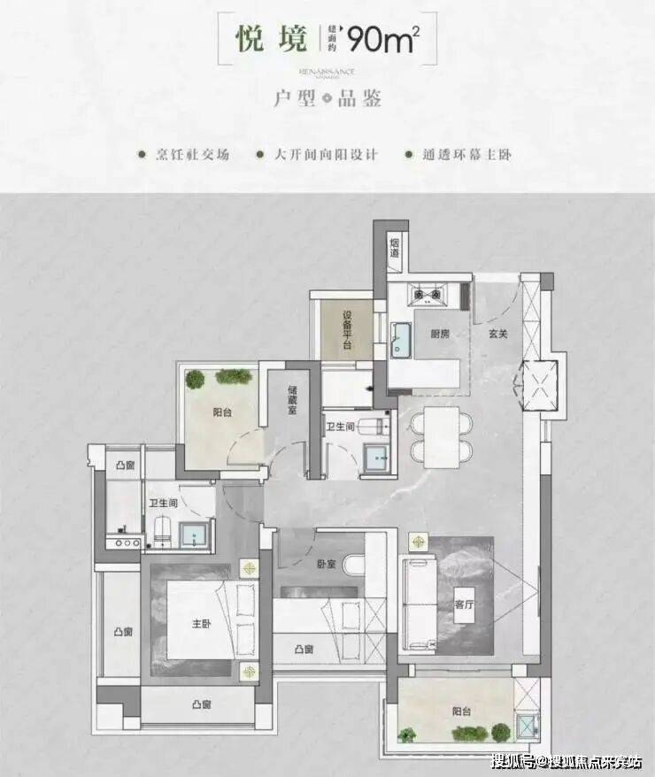 90㎡的3房2厅2卫,设计的是经典竖厅格局,进门入户玄关,LDKB一体化,S墙设计预留冰箱卡槽位,三开间朝南,U型厨房,卫生间干湿分离,还带1个设备平台,得房率约94.1-95.74%(包含赠送),西南朝向。