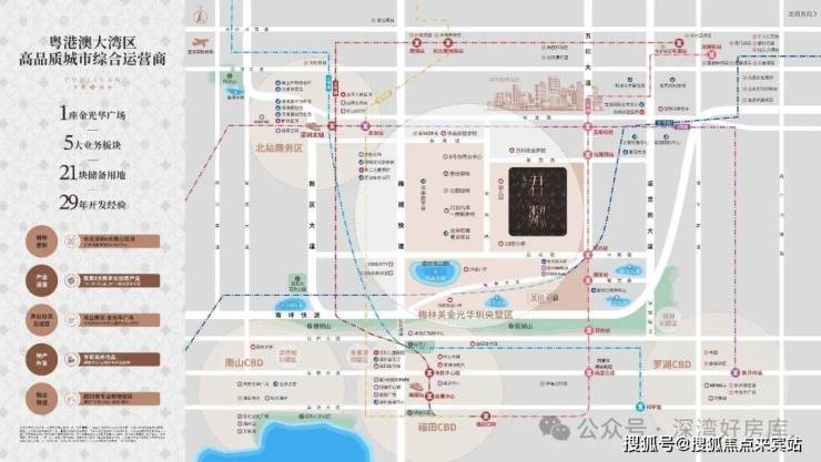 ①双枢纽(深圳北站+五和站),1小时无缝对接大湾区;五和站城际枢纽,5/10号线及规划中的深大、深惠、深广中轴城际。