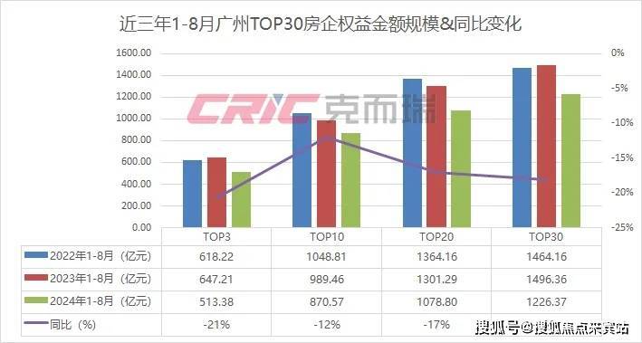克而瑞统计到,2024年1-8月广州权益金额TO30房企业绩规模为1226.37亿元,同比减少18%。