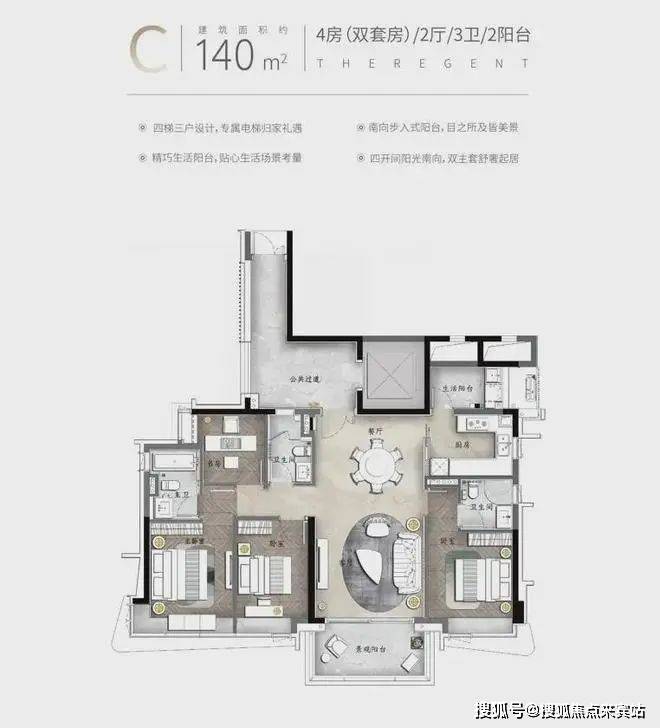 『天启』组团面积约140-250㎡环幕临江大平层,坐拥江景第一排,眺望小蛮腰,享500米宽阔无遮挡江景视野,并邀请三大全球知名设计大师倾力打造,并配备12大国际一线品牌交标,专梯专户四房双套房设计,世界灵感前沿作品礼献广州!