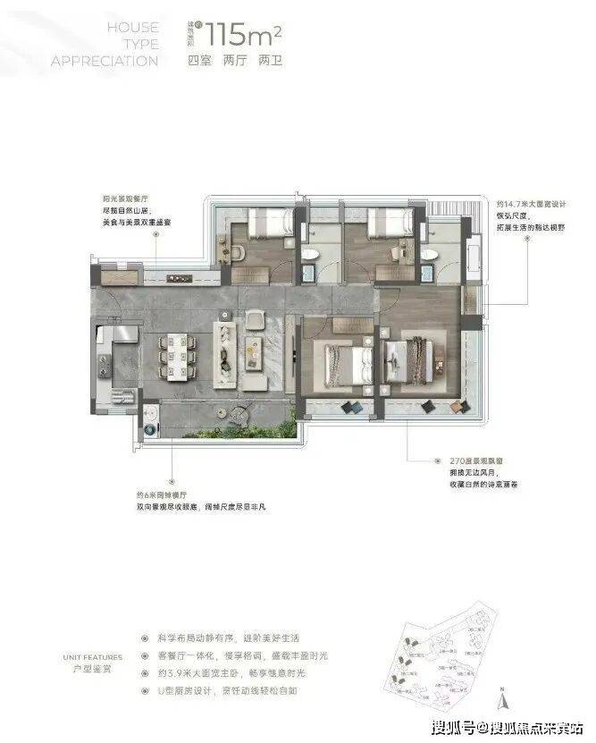 户型亮点:横厅南北通透格局,通风采光与空间开阔感兼具;全能四房设计,可灵活规划为子女房、老人房、书房、亲子游乐区等,适配多元家庭需求;270°全景飘窗+6米长大阳台,拓展空间利用率与观景体验;折后总价890万起,完美匹配追求功能全能性与居住舒适度的改善家庭。