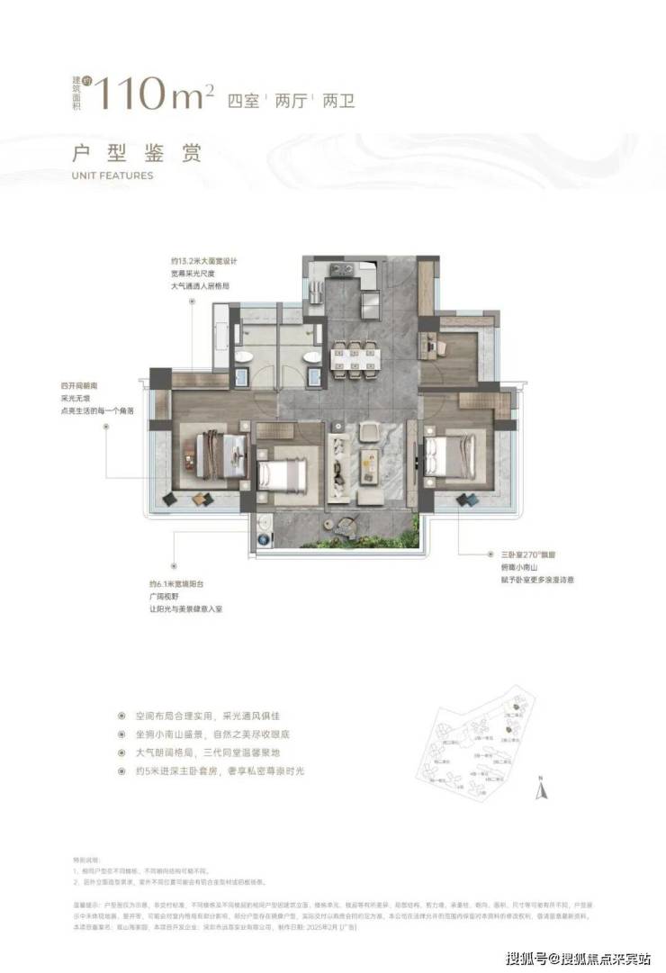 户型亮点:专梯入户+纯板楼设计,彰显高端居住尊崇感;超97%极致得房率,空间利用率行业领先;270°全景飘窗+6.1米长大阳台,尽享山景与园林双重景观;全能四房布局,适配三代同堂高端改善家庭;折后总价1080万起,精准匹配追求高端居住品质、稀缺景观资源及纯粹圈层的高净值人群。