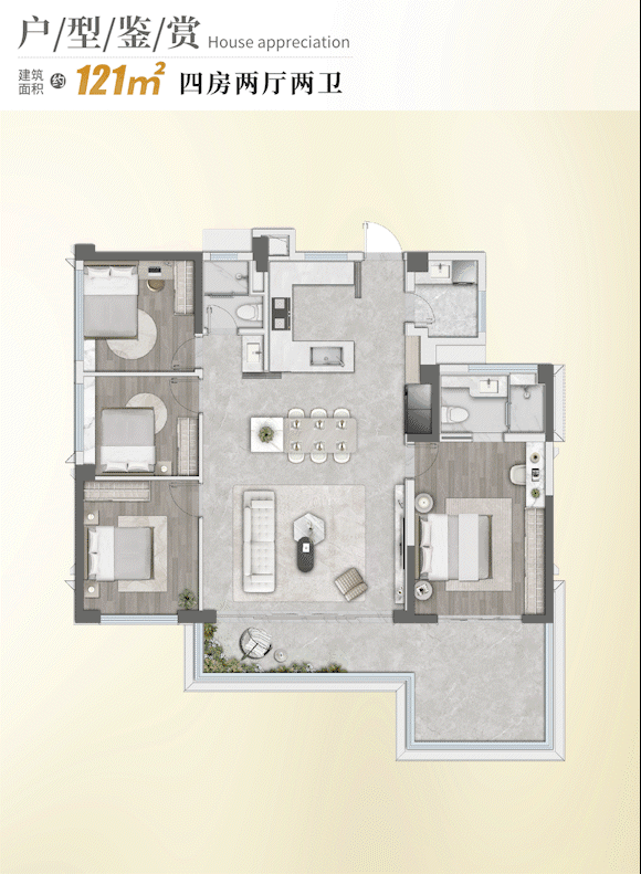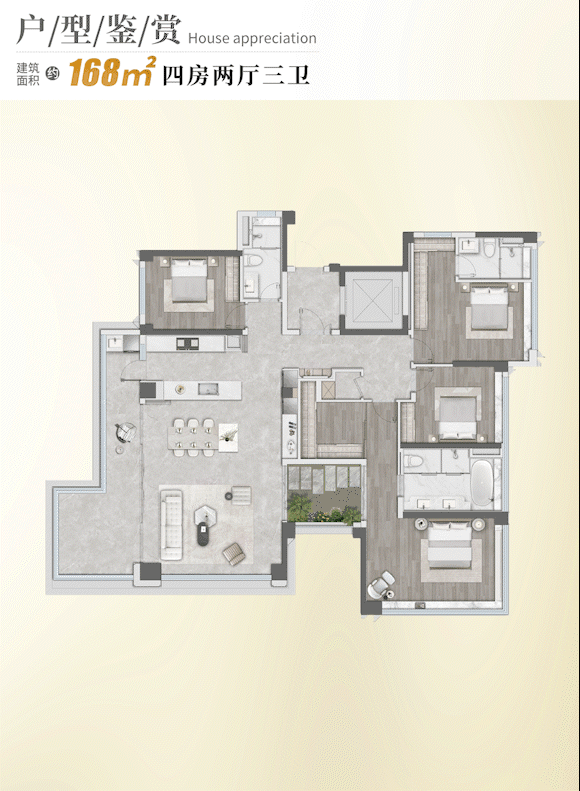 该户型为高端改善型大四房,其最大亮点为三卫双套卧设计,可以充分满足“三代同堂”的居住需求。