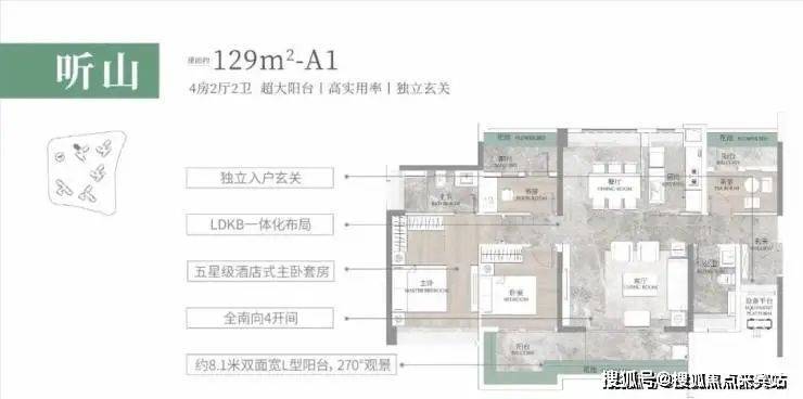 建面约129㎡听山户型,阳光玄关设计,兼容了户内的私密性,储物空间又是全明采光,也符合广东地区对风水的理解,舒适性和实用性都考虑到。