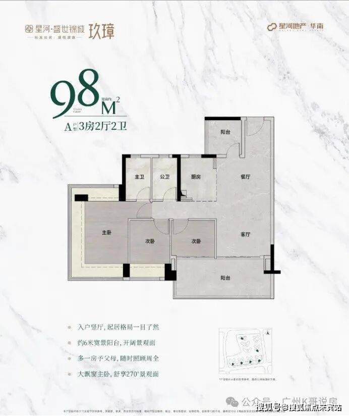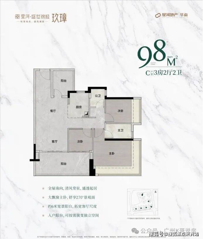 98㎡户型全新升级,主朝向朝南,让阳光洒满每一个角落。主卧配备 270° 无柱飘窗,视野开阔,美景尽收。次卧和阳台尺度大幅增加,提供更加舒适的居住体验,无论是休闲娱乐还是晾晒衣物都更加从容。