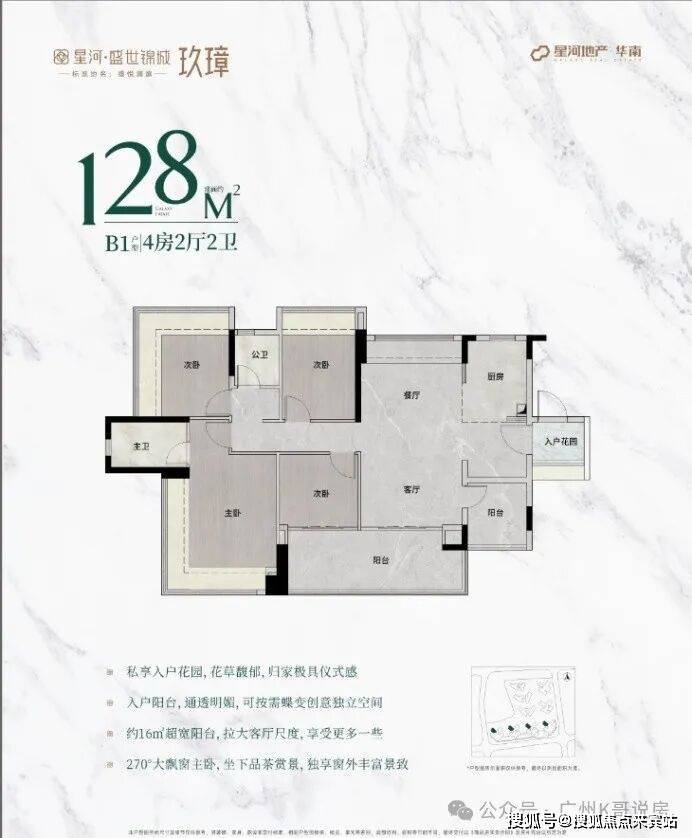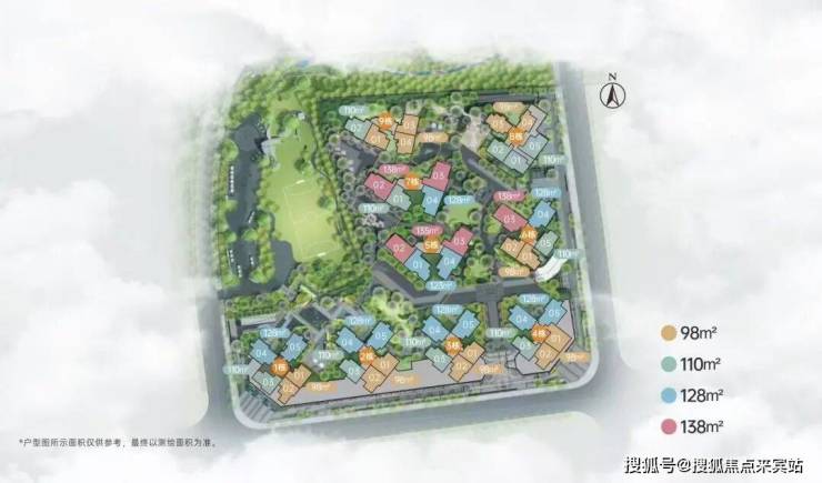 有三个面积段,98-110-128㎡三至四+1房,共有5个户型,都是新规设计,实用率达100%以上。