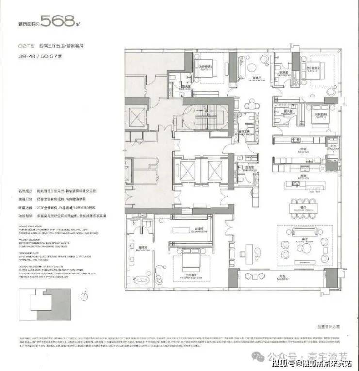 主打总裁级大平层,5种主力户型(304-1000㎡),层高3.6-3.9米,通燃气、配备超大阳台,部分户型采用270°环幕视野,使用率70~75%。