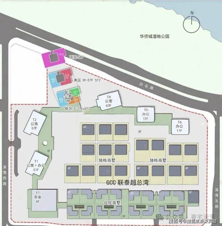 「GCC联泰超总湾」位于南山深超总基地核心区,深湾四路与白石四道交汇处东北侧,东面是「华侨城蓝楹湾」,南面是TCL和学校用地,西面是京东深圳总部,北面是华侨城湿地公园。