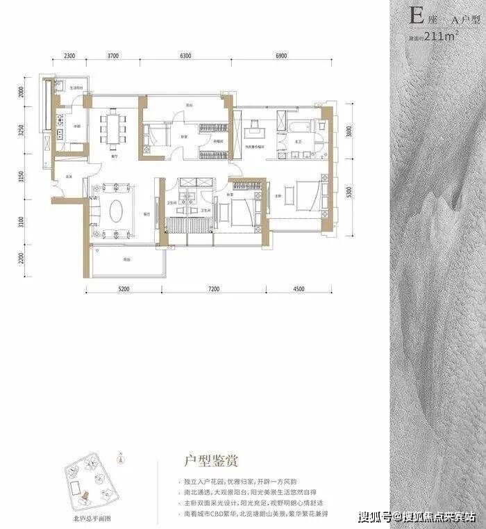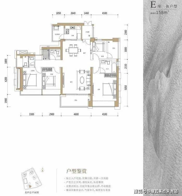 1栋E座:141.7米,44层 共123户,朝南为主,三梯三户