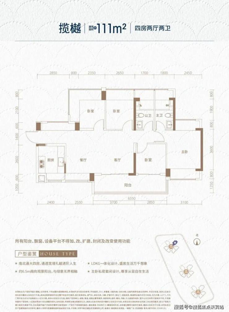 111㎡的4房2厅2卫,折后总价361-382万/套,单价3.24-3.57万/㎡。