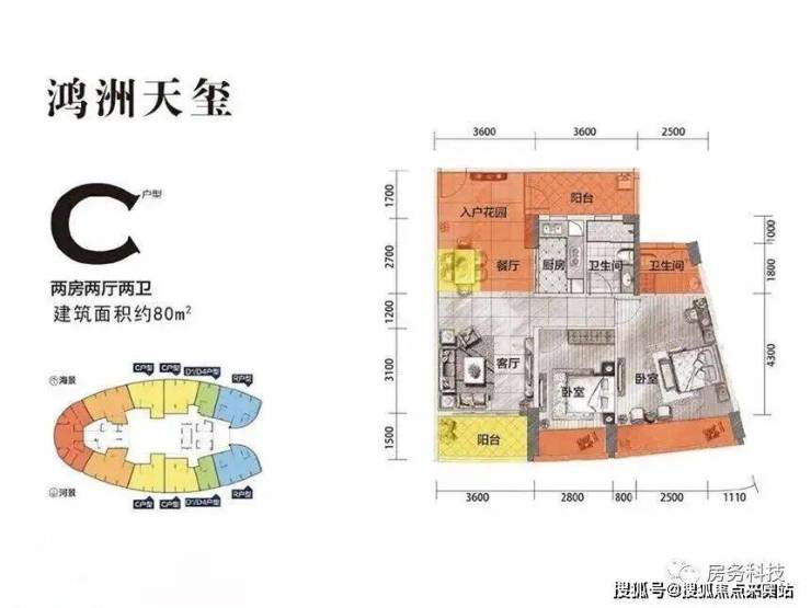 C户型 两房两厅两卫 建筑面积为80㎡