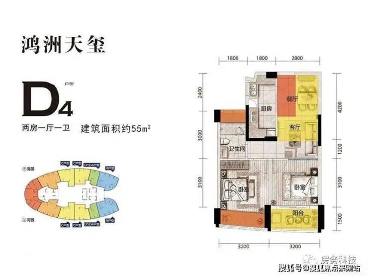 D1户型 一房两厅一卫 建筑面积为55㎡