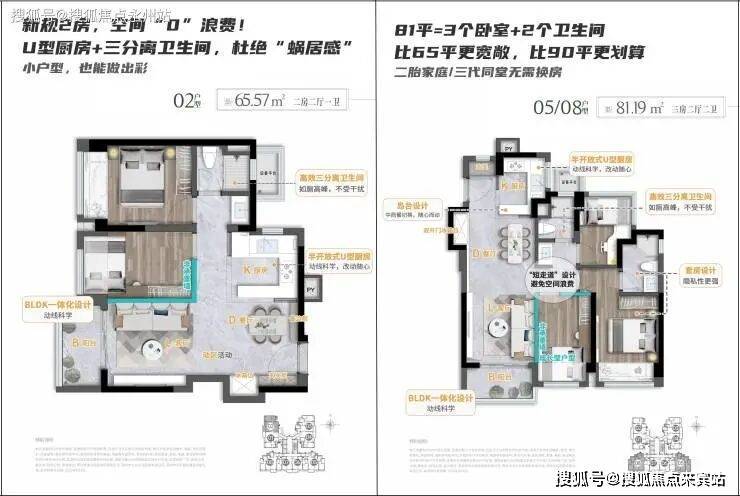 项目主推建面约65-81㎡的2-3房产品,均为新规后设计,得房率高达88%-91%(含赠送面积),具体分布如下: