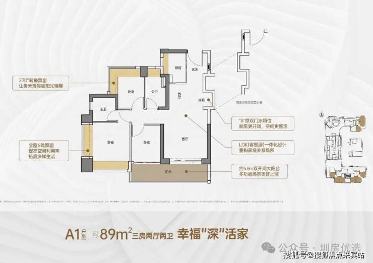 89㎡的3房2厅2卫,,得房率约71.16-72.57%(不含赠送),正西向、正东向或正南向。套内面积64.89㎡+赠送面积10.68㎡=实得75.57㎡,加上赠送后得房率约84.53%。