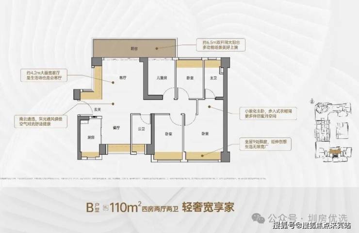 110㎡的4房2厅2卫,得房率约72.52-72.57%(不含赠送),阳台主朝北向。套内面积80.06㎡+赠送面积13.31㎡=实得93.38㎡,加上赠送后得房率约84.64%。