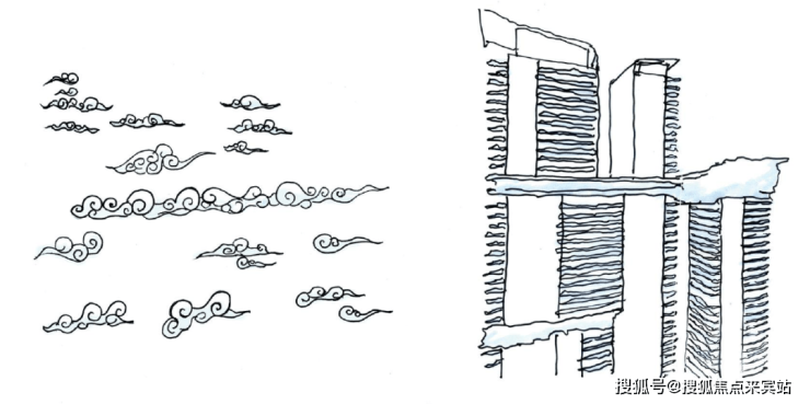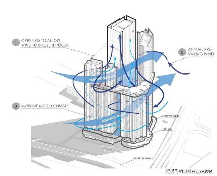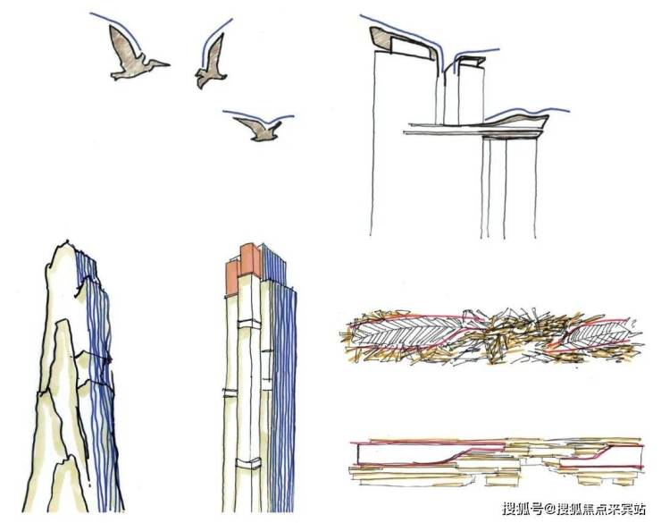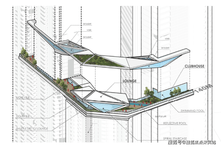 塔楼错落犹如山石,裙楼动感的轮廓如同群山间大鹏的巢穴,空中连接各塔楼的150米天际花园及顶层会所,以起伏的轮廓和动感的屋顶,模拟大鹏展翅,共同构成了一幅“南鹏立万丈山展翅而发”的画卷,寓意片区的辉煌发展。