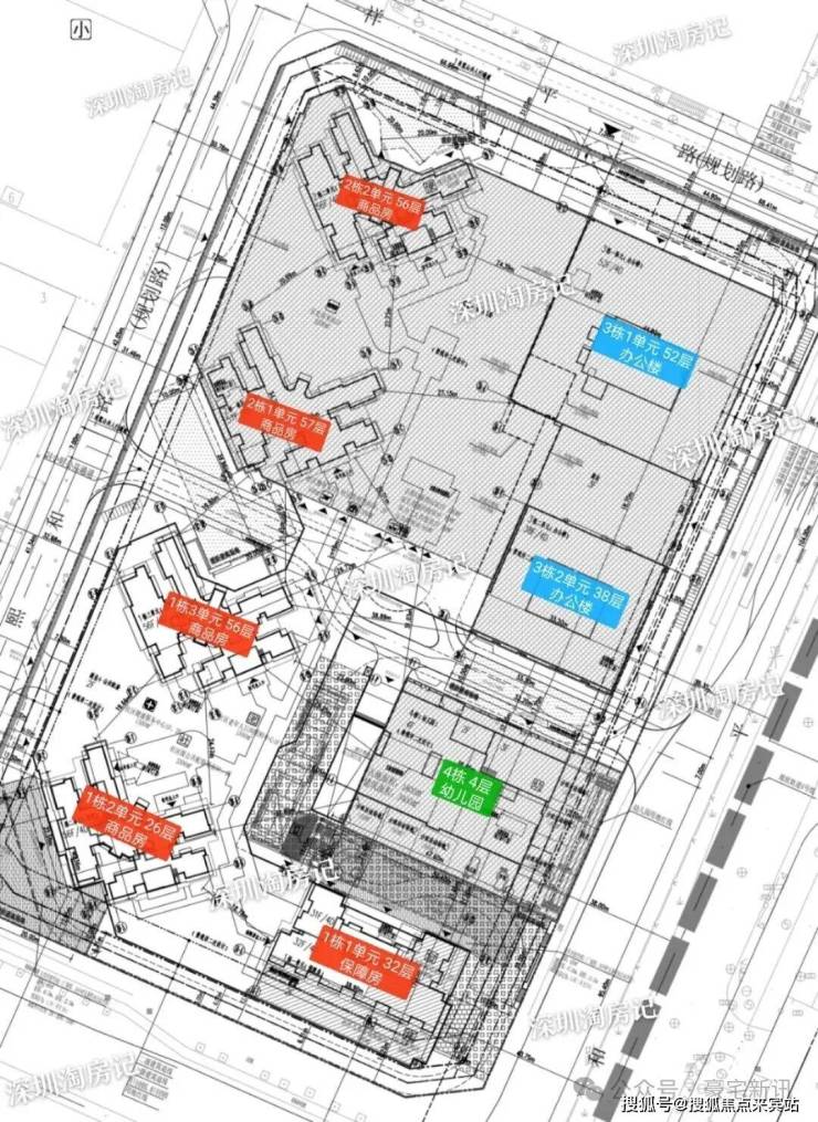 【建筑信息】4栋商品房56-57层,1栋保障房32层,2栋写字楼38、52层,共计7栋