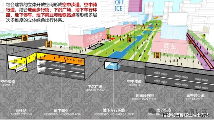 立体交通——未来片区多层次、多维度的立体绿色出行体系。双地铁上盖,市政规划的空中连廊系统,“0”距离接驳全城。