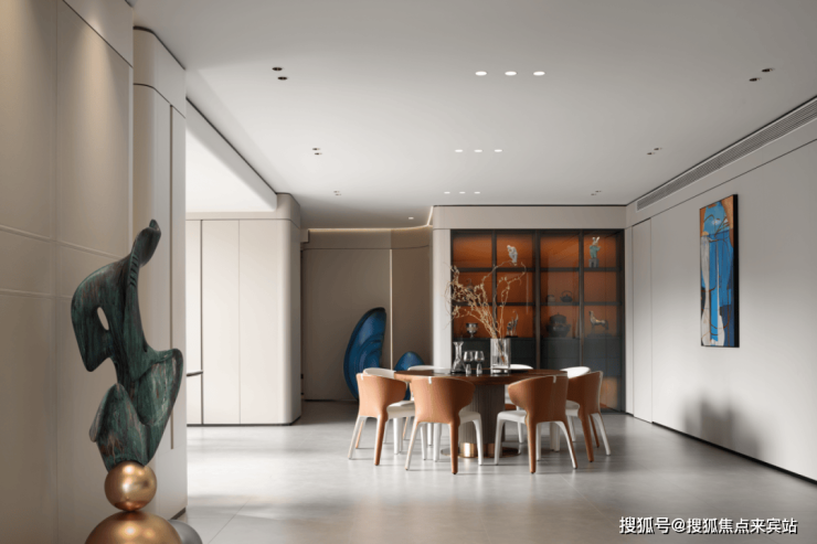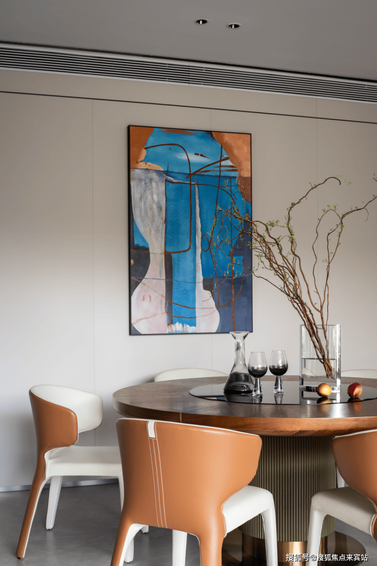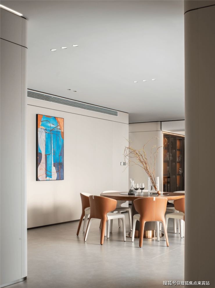餐厅似精心绘制的画卷。圆形餐桌沉稳大气,配色彩明快的餐椅,橙白交织,活泼且优雅,似在邀人欢聚。