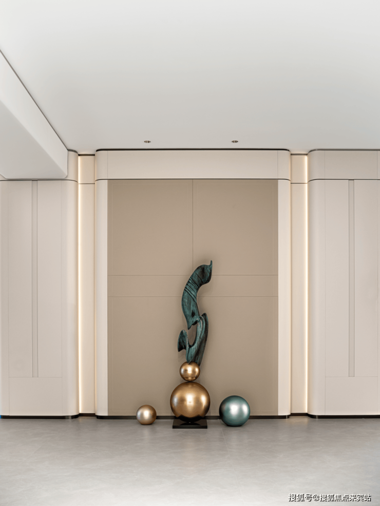 入户处,一尊造型别致的雕塑映入眼帘。其线条灵动,宛如自时光长河跃出的精灵,携神秘迷人气息,为别墅空间添了份灵动与趣味。