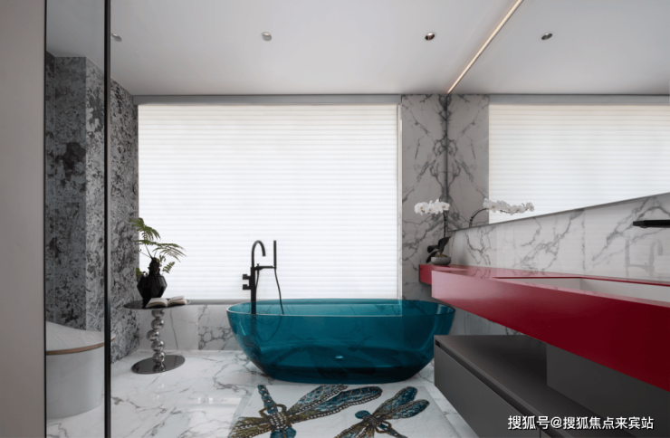 浴室里,色彩碰撞、材质交融,营造独特别墅设计氛围。大理石尽显稳重高雅,鲜艳色彩赋予活力时尚,绿植花卉点缀其中,生机温馨满溢,是舒缓身心、忘却疲惫的理想之地。