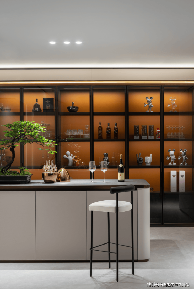 简洁吧台置精致铜冰桶、剔透高脚杯与开瓶红酒,似盼人举杯畅享惬意。吧台边,简约时尚高脚凳静立,黑白配色,现代舒适如低调绅士,候业主入座。