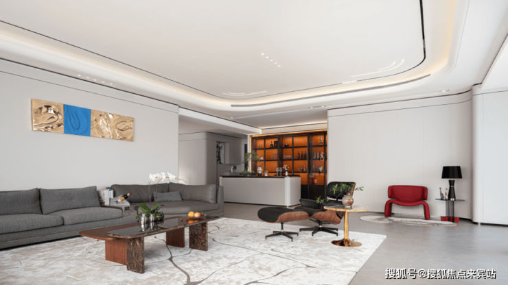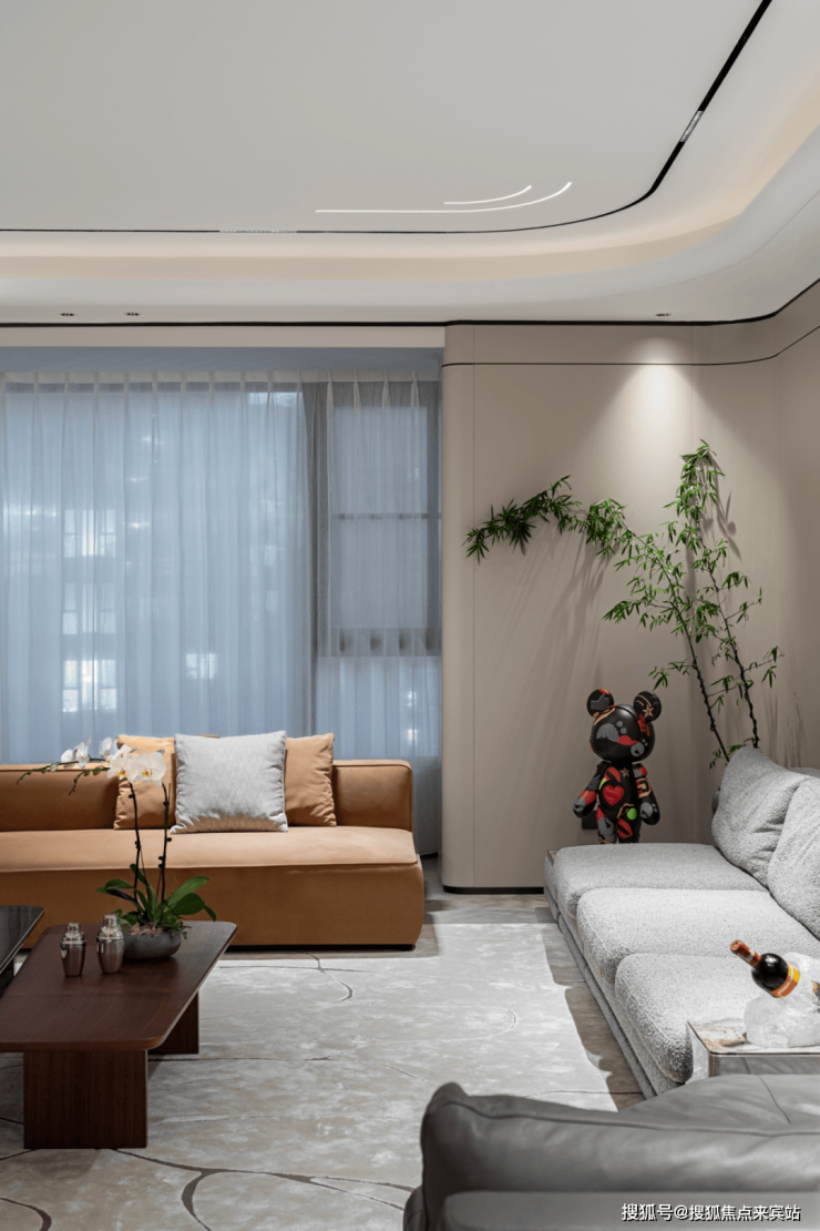 走进客厅,宛如置身现代与温馨交织的理想天地。天花板线条简约流畅,经巧妙设计的灯带与筒灯,如点点繁星,为别墅空间营造出柔和明亮的氛围。