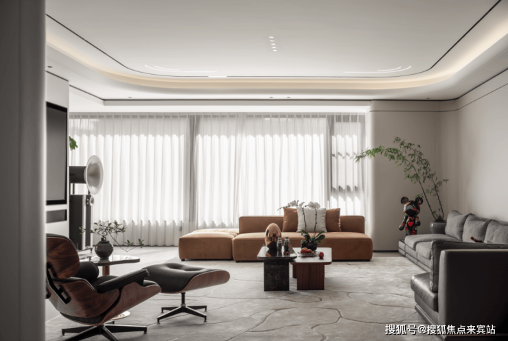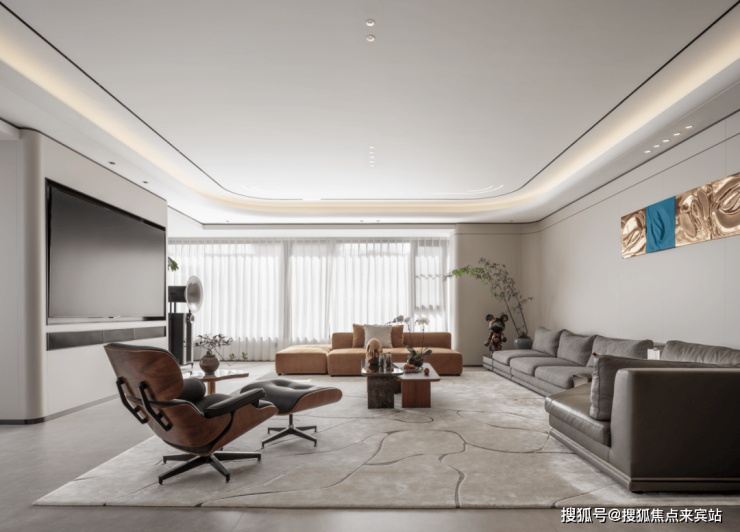 深棕色沙发沉稳相对,似宽厚长者静候依靠。一旁,经典伊姆斯躺椅配小巧脚凳,深棕木纹理与黑色皮革相衬,尽显优雅舒适,诉说着悠闲时光。