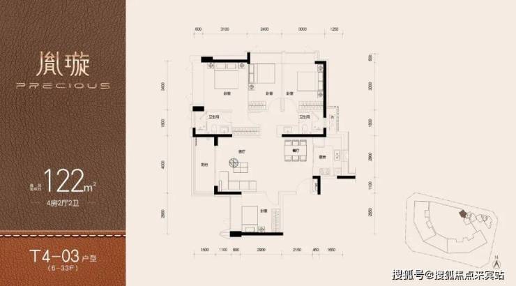 T3栋是2梯3户设计,A、B户型面积为122㎡的4房2厅2卫,都是西南朝向,C户型是122㎡人才房,一共17套。