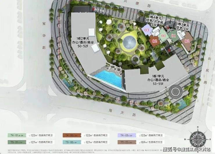 其中住宅楼为T3栋和T4栋拼接在一起,限高99.9米33F。住宅指标20000㎡包含商品房和人才房——131户住宅商品房、17户人才房(只租不售)。外立面是银灰色的铝板幕墙+幕墙窗设计,尽显高级。