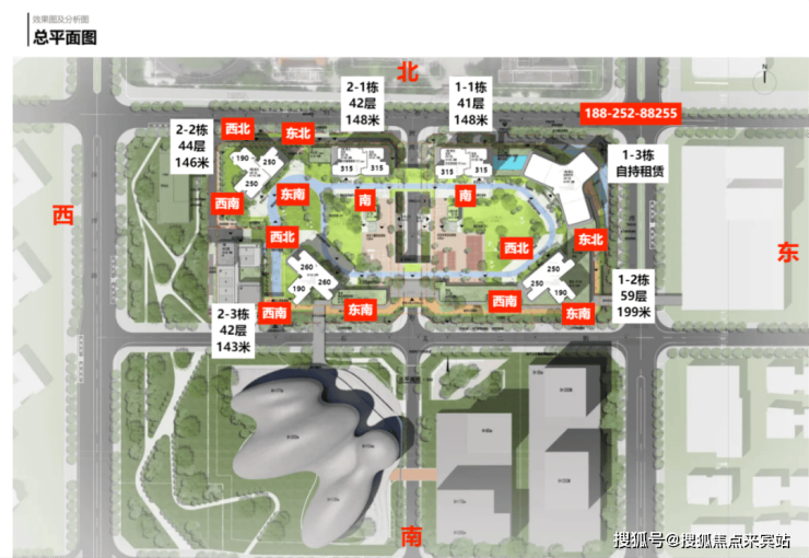 总楼层:1A栋41层;2A、2B、2C栋42层,1B栋59层,1C栋自持租赁54层,幼儿园4层。