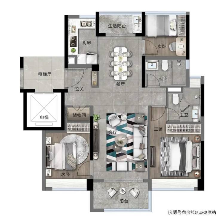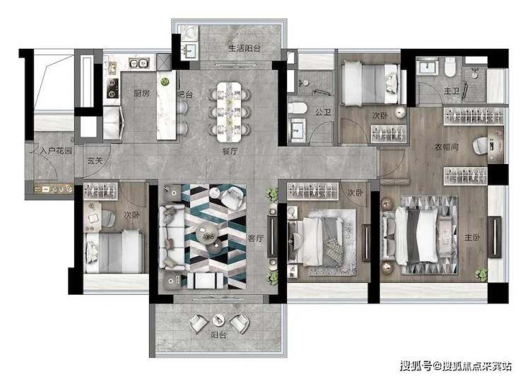 ⑥LDKG厅厨阳台一体化,公共空间扩大。