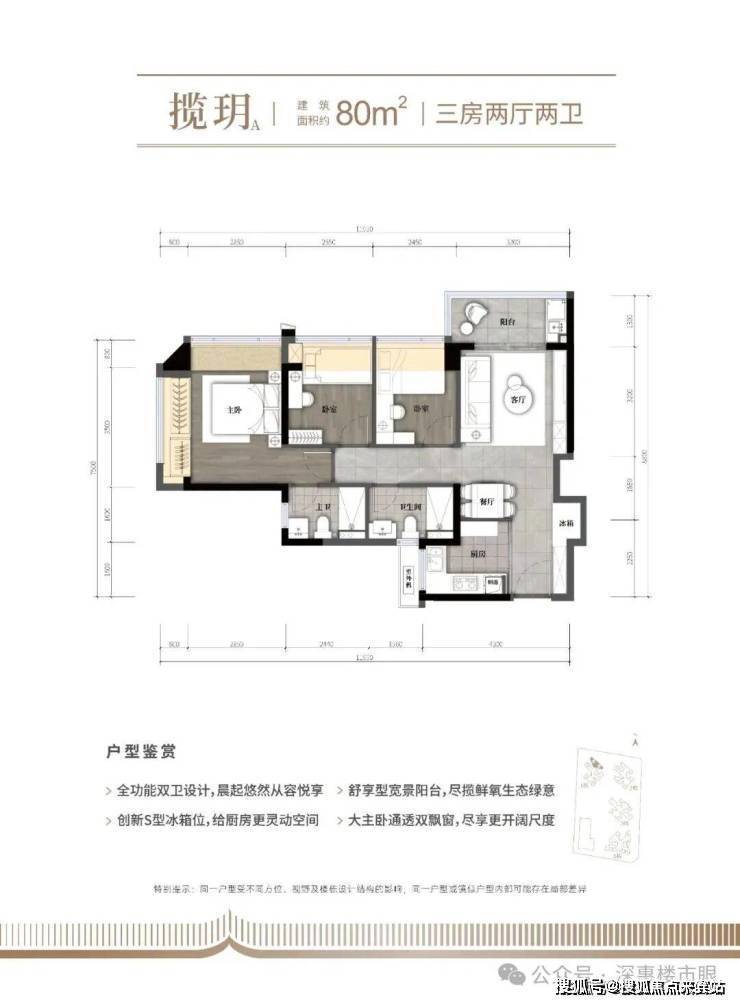 80㎡的3房2厅2卫,设计的是竖厅格局,客厅3.3米开间,LDKB一体化,S墙设计预留冰箱卡槽位,动静分区,分别做到了主卧16.38㎡/次卧8.16㎡/次卧7.84㎡(包含墙体飘窗),U型厨房,卫生间干湿分离,得房率约79.1%(不含赠送),阳台4.95m²东北朝向。套内面积63.98m²+赠送面积11.55m²=实用面积75.53m²,加上赠送面积后得房率94%。