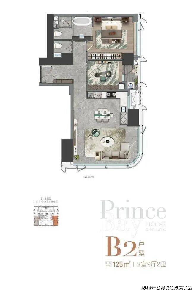 东南、西南向(9-38层) B2户型,125㎡ 2室2厅2卫,客厅也有270°弧形采光面,主卧虽没有独立衣帽间,但是有一个带浴缸的卫生间!