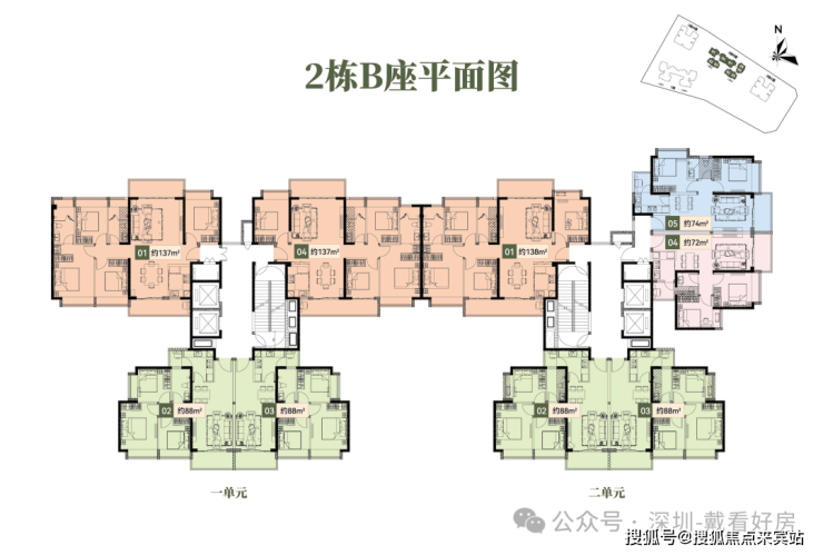 2栋B座一单元01、04户型、2栋B座二单元01户型:面积约为137-138m2的4房2厅2卫;