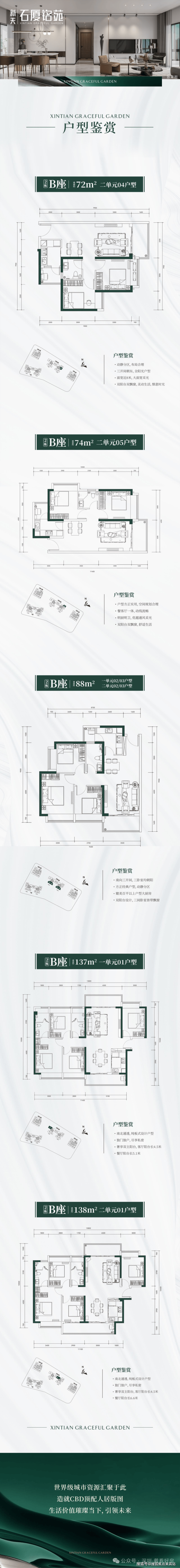 新天石厦铭苑共有三个面积段、五个户型