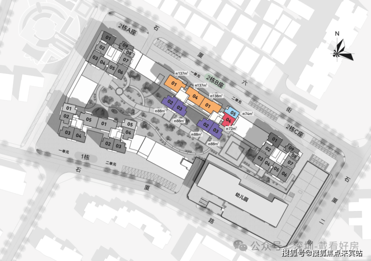 建筑分布:1栋分1、2单元,2栋分A、B、C座(2B座含1、2单元),3栋为幼儿园,规划清晰有序。