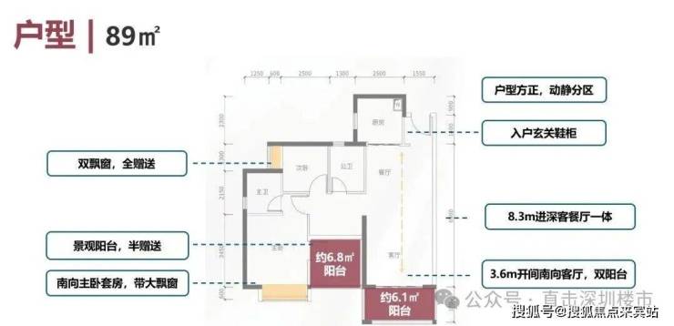 建面约89㎡的户型可以说是优质户型,客厅开间尺度和卧室尺度上做到了均衡,客厅开间约3.6米,主卧开间约3.3米,远超市面上同等面积的户型尺度。完全可以媲美一些超高层100㎡以上的户型尺度,进门看的第一感觉就是采光非常通透,视野开阔,看大雁山和石岩湖,格局也很方正。