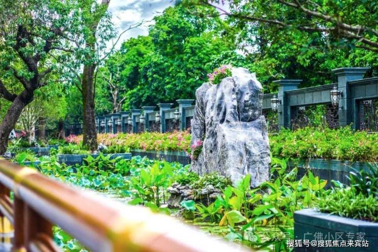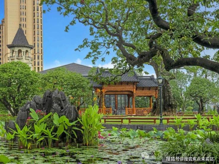 以水为核心,以约200多棵高大乔木、约29组富贵绿石及英石为主要景观,大量荷花等水生植物作为衬托,园林和建筑融合得美轮美奂