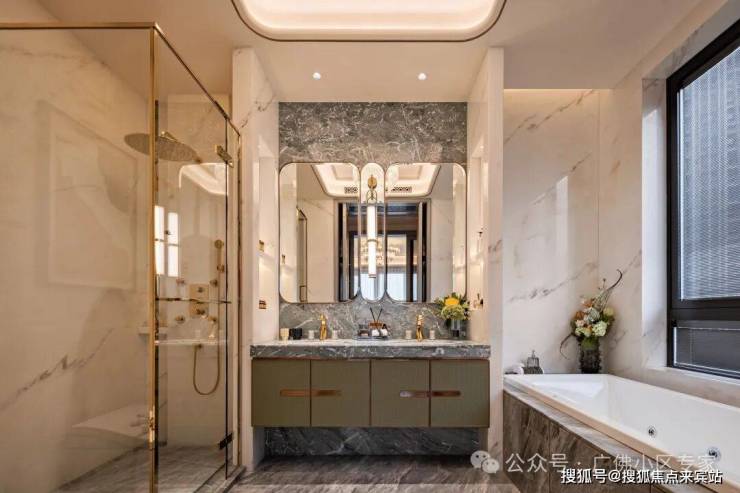 🌙 主卧浴室墙面采取马德望白奢石,地面是普拉达绿奢石;