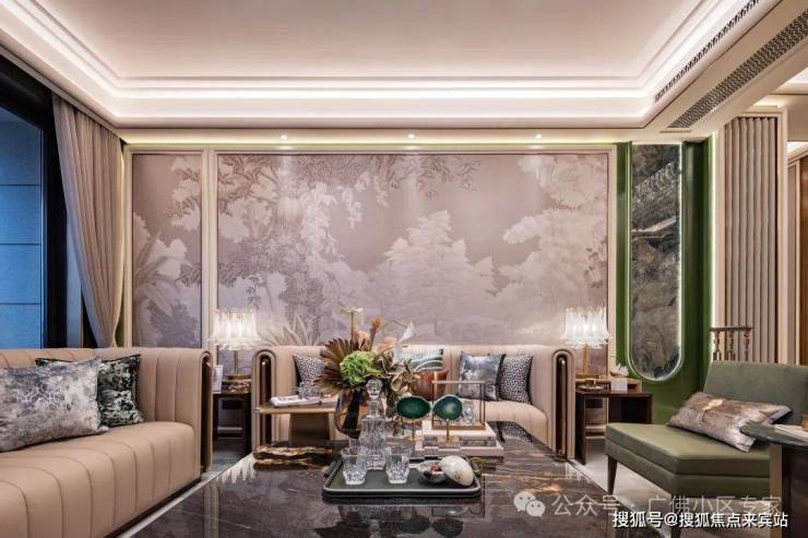 ✨客厅背景墙为阿玛尼底材刺绣墙艺,营造清雅美学。
