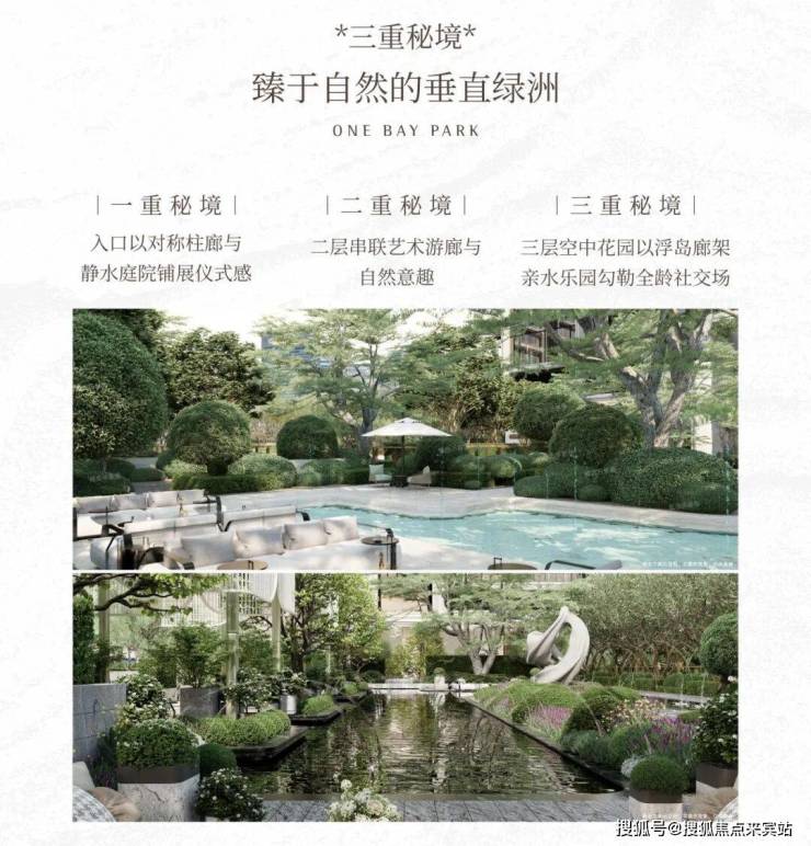 “三重秘境”景观:从入口静水庭院到中心下沉镜面水院,再到空中花园,将自然、艺术与生活理念深度融合。